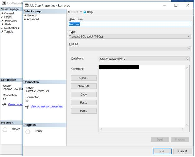In Steps tab, click New and enter step name, select Type as Transact-SQL script (T-SQL) and select database and put EXEC procedure name in command area.